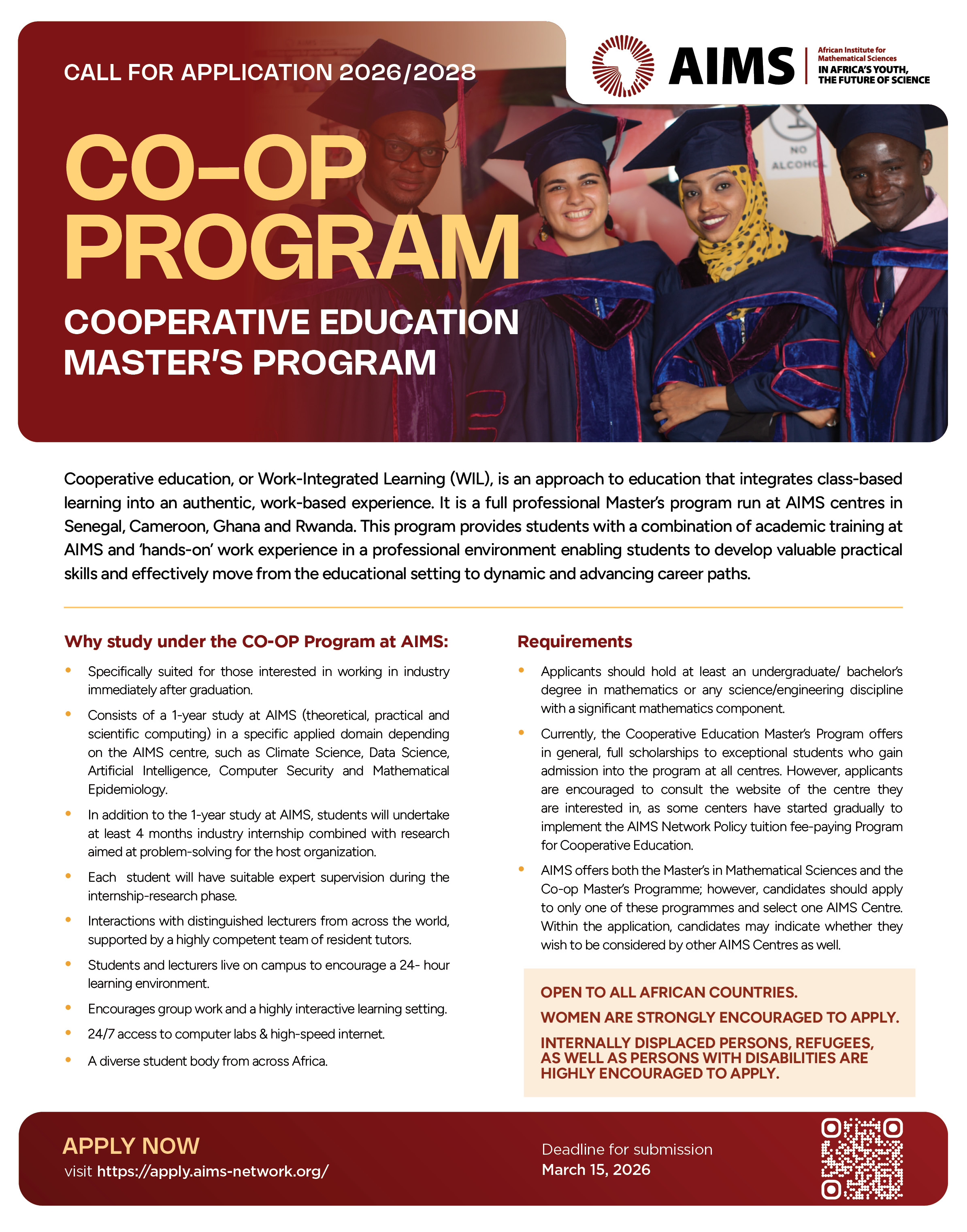 Apply for the AIMS Master’s in Mathematical Sciences and CO-OP Master’s Programmes